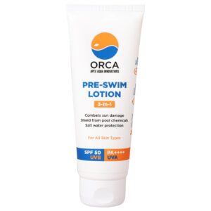 Before jumping into the water, protect your skin. The swimmer's skin absorbs less chlorine thanks to the layer of Swim Care Pre Swim Body Lotion. The skin is protected by Swim Care Pre Swim Body Lotion, which prevents pool rash, itching, and drying. Additionally, it shields the skin from chlorine odor. It is appropriate for all ages.